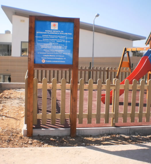 Painel informativo com postes de madeira em pinho tratado. Dimensão: 1,80 m x 0,9 m x 0,95 m.