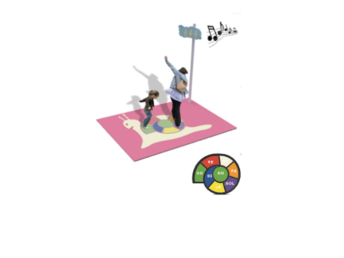 8 sistemas sensíveis correspondentes ao jogo; Cria melodias movendo-se sobre o caracol; Exibição de nota no ecrã e correspondente difusão sonora; Superfície: 5m2.